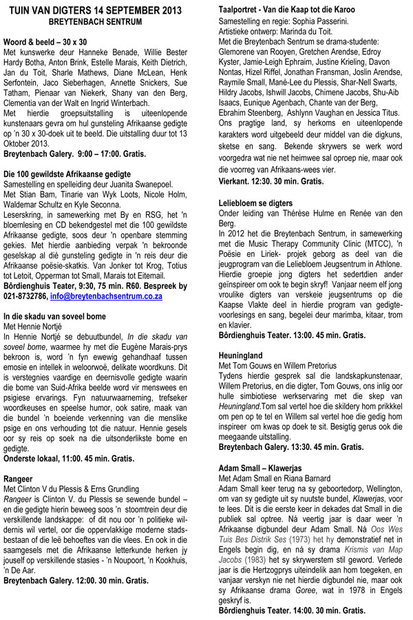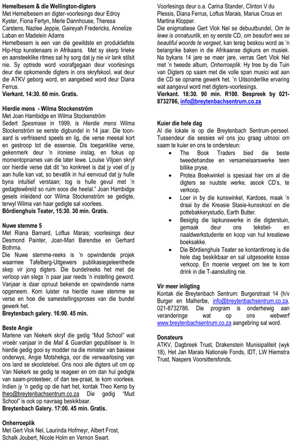 Kontak die Breytenbach Sentrum: Burgerstraat 14 (h/v Burger en Malherbe, info@breytenbachsentrum.co.za, 021-8732786. Die program is onderhewig aan veranderinge wat op ons webwerf www.breytenbachsentrum.co.za aangebring sal word.