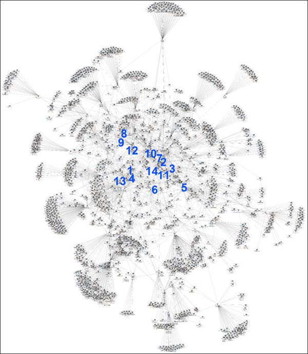 In die volgende sosiogram is bogenoemde skrywers (slegs dié met graadsentraliteite van 15 en meer) in die sentrum van die verwysingsnetwerk, terwyl dié wat minder gereeld aangehaal word, op die periferie verkeer (nommers stem ooreen met die nommers op bostaande lys):