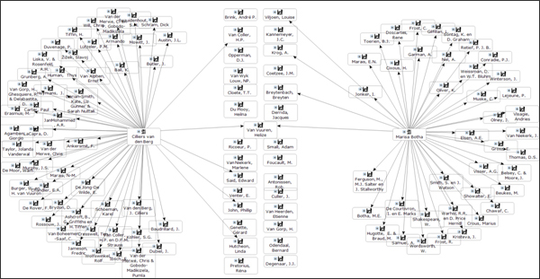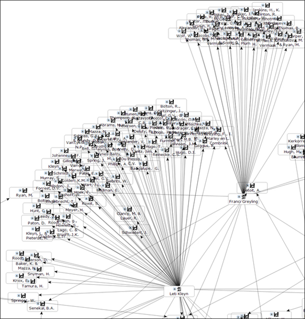 Hieruit is ’n datastel saamgestel waarop aangedui word watter skakels daar tussen skrywers en joernale bestaan; met ander woorde daar is aangedui dat artikel a in joernaal b verskyn het, geskryf deur skrywer c, en verwys na skrywers d, e, f, ensovoorts, wat onderskeidelik in joernale of boeke g, h, i, ensovoorts gepubliseer het. Die uiteinde is ’n netwerk waarop 2 672 entiteite se 5 753 onderlinge verbintenisse voorkom. Vervolgens is die netwerk verder ontleed met behulp van rekenaarprogrammatuur, soos in die volgende afdelings bespreek.