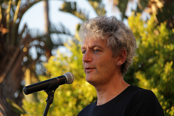 Jaco Fouché, wat die derde prys gewen het met sy manuskrip, Liefste Lena. Jaco het onder andere sy vrou Lorraine, wat hier by hom sit, bedank omdat daar wêrelde vir hom oopgegaan het sedert hy haar ontmoet het. Hy het in sy toespraak gesê dat hy nooit die boek sou aangepak het as dit nie vir Lorraine se motivering was nie. |