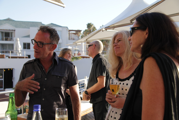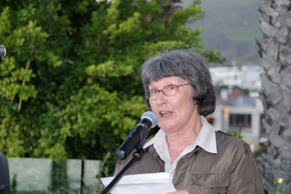 Daniel Hugo, Joan Hambidge, Eben Venter en ander gaste luister na Eloise Wessels, wat die verwelkoming gedoen het. |