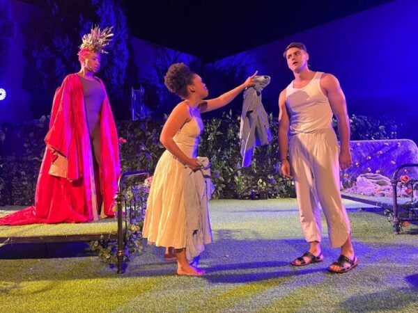 From the very first line until the very last, I was hooked. The mechanicals’ play had me in stitches, struggling to breathe. Every moment of humour was highlighted subtly and cleverly without ever becoming slapstick or indulgent. True, this is not what I pictured in my head. I saw the fairies as creatures of light, barely touching the ground. I saw Puck as a little cherub tottering around creating accidental havoc. Titania and Oberon like graceful elves from Lord of the rings. Instead, I was given a slightly menacing Puck who bounced around the stage with brilliant physicality and revelled in the disaster he created. Casting a differently abled actor in the role brought unexpected new layers. The fairies, played by the same actors as the mechanicals, were slightly misshapen and awkward comical versions – definitely not Tinkerbells. And in this version, Oberon and Titania, a gender-fluid interpretation that worked extremely well, came across more like petty children than almighty beings. If you told me these things beforehand, I would have expected disappointment. Instead, I absolutely loved it. It is a much more comedic take than is normally performed – and probably closer to what Shakespeare envisioned.