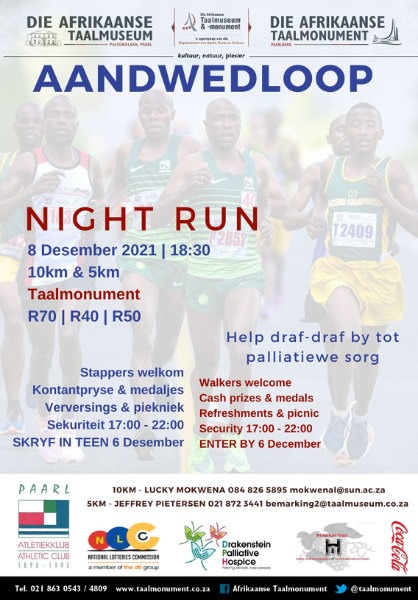 Met die groeiende uitdaging om die lewensgehalte van pasiënte met lewensbedreigende siektes, asook hul gesinne, te verbeter, is dit nou die tyd om draf-draf (of stap-stap) geld in te samel vir die Drakenstein Palliatiewe Hospies. Boonop is talle medaljes en kontantpryse op die spel wanneer die Afrikaanse Taalmuseum en -monument (ATM), Historium Trust en Paarl Atletiekklub se Aandwedloop op Woensdag, 8 Desember 2021, op die beeldskone Paarlberg plaasvind.