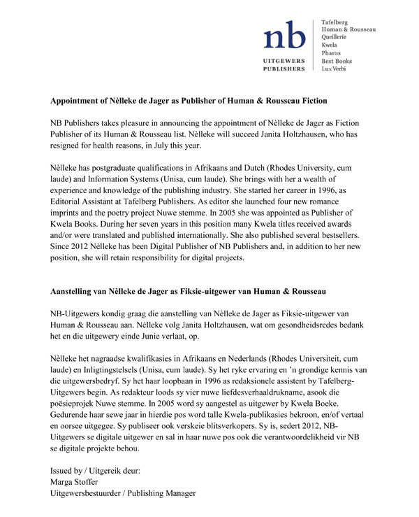 Aanstelling van Nèlleke de Jager as Fiksie-uitgewer by Human & Rousseau