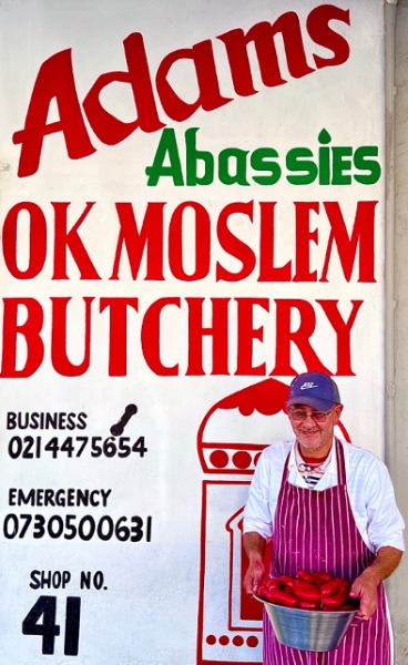 “It’s important for the readers to know that if they can’t make it to Adams Moslem Butcher here in Walmer Estate, they must kanallah (please) support my cousin, Anwar Adams, at the Manenberg branch of Adams Moslem Butcher, or my other cousin, his elder brother, Sameer Adams, in the Mitchells Plain town centre – both continuing the legacy of Abassie and his warme worsies.”