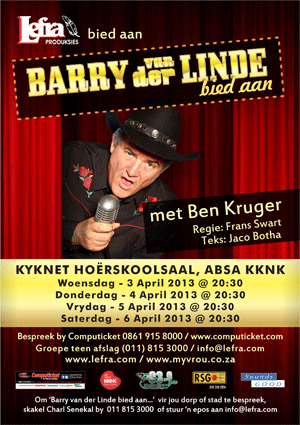 Bespreek jou kaartjies vir Barry van der Linde bied aan ... nou by Computicket by 0861 915 8000 of www.computicket.com. Vir groepbesprekings en gasvryheidspakkette, skakel Lefra Produksies by 011 815 3000 of stuur ’n e-pos na admin@lefra.com.