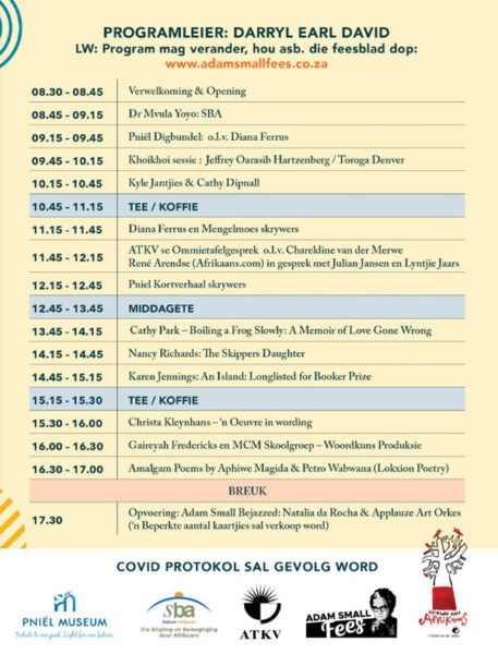 Hallo Darryl, geluk daarmee dat jy vanjaar weer die Adam Small-boekefees reël! Wanneer vind dit plaas?