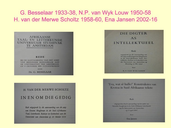 In april 2002 trad ik aan als bijzonder hoogleraar Zuid-Afrikaanse letterkunde; een jaar later, op 11 april 2003, stond ik achter dit spreekgestoelte mijn oratie te houden – with a little help of my friend Corine de Maijer. De keurig opgestelde computer ging namelijk pal voor mijn neus in slaapstand net toen ik wilde beginnen. Ja, toen was een PowerPoint in deze ruimte nog niet gebruikelijk - men waarschuwde mij er zelfs voor dat de vijf plaatjes die ik wilde laten zien de zeer gewaardeerde toehoorders zouden afleiden van mijn gesproken tekst. Vandaag weten we beter en ik zal zeker veel meer dan vijf plaatjes laten zien.