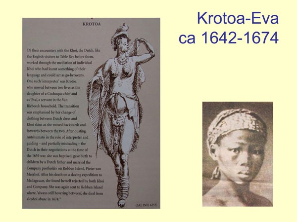 Shortly after Jan and Maria van Riebeeck and their children arrived at the Cape in 1652 the young girl came into their service and was renamed Eva. Soon she could speak fluent Dutch and Van Riebeeck started employing her as an interpreter.