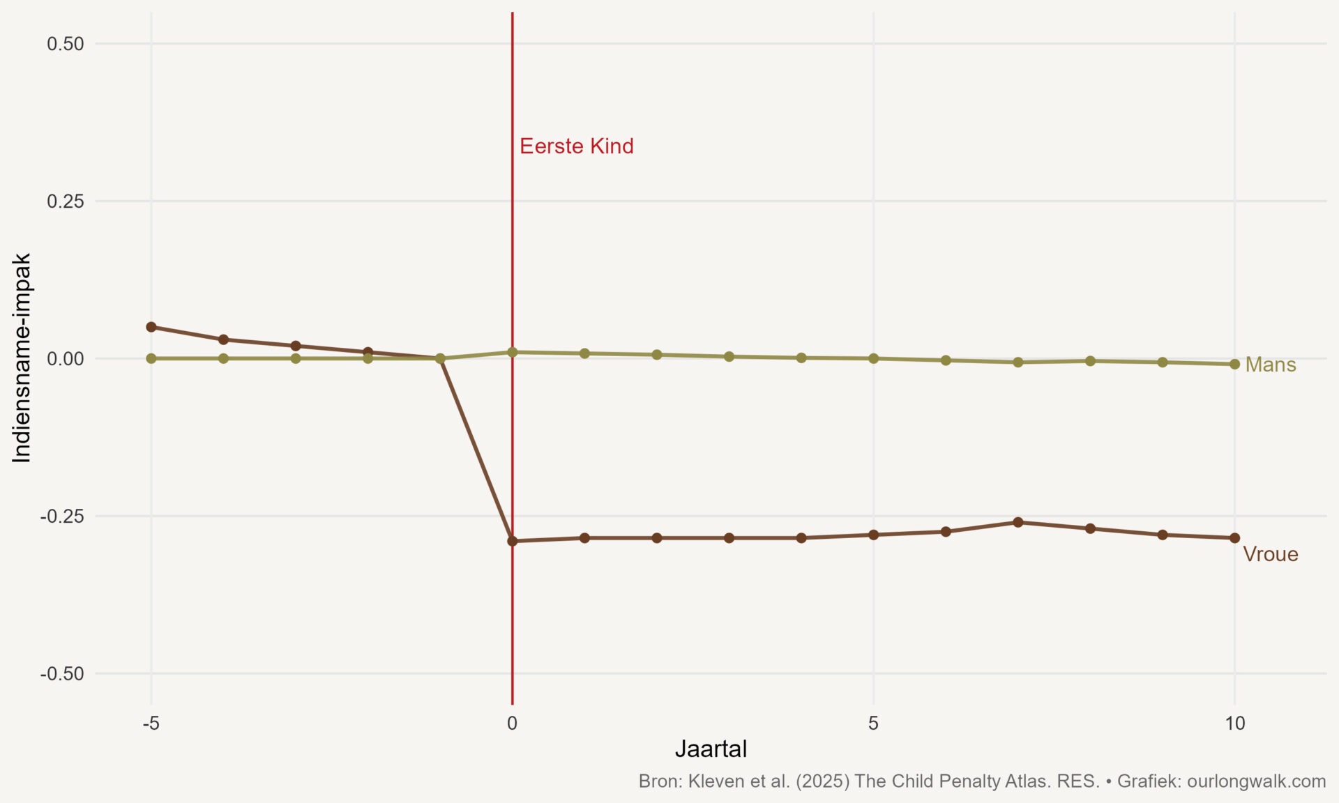Bababoete in indiensneming, Suid-Afrika – Kleven et al. 2025. Mans se indiensneming bly stabiel ná die eerste kind; vroue s’n daal met sowat 28 persentasiepunte en herstel nie. Klik hier vir ’n groter weergawe van die grafiek.
