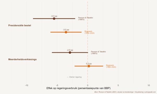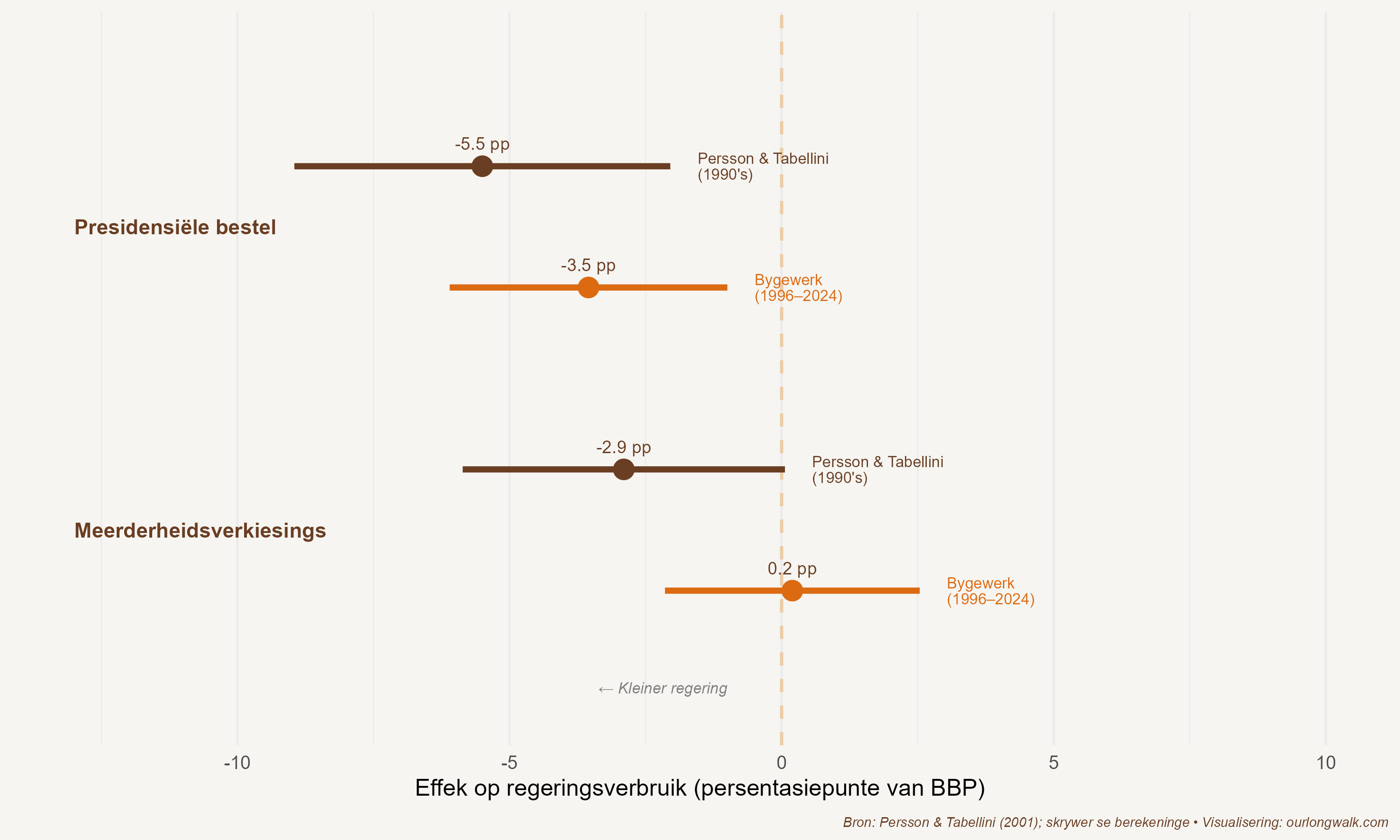 Die grafiek wys hierdie vergelyking duidelik. Die donker segmente toon Persson en Tabellini se oorspronklike ramings uit die 1990’s; die oranje segmente wys my bygewerkte ramings. Die presidensiële verskil het van sowat 5,5 tot 3,5 persentasiepunte afgeneem, maar bly duidelik negatief. Die meerderheidsgebaseerde verskil het van –2,9 tot bykans nul beweeg.