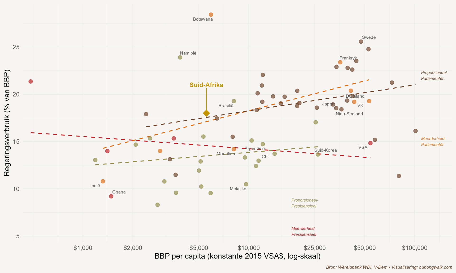 Die spreidingsgrafiek wys die basiese prentjie. Elke punt verteenwoordig ’n demokrasie wat volgens sy grondwetlike groep ingekleur is. Suid-Afrika (in goud aangedui) val netjies binne die groep van proporsioneel-parlementêre stelsels. Die land bestee sowat 18% van sy BBP aan staatsbesteding – minder as Botswana (’n meerderheidsgebaseerde, parlementêre stelsel, op 28%), minder as Swede (26%), en min of meer dieselfde as Duitsland en die Verenigde Koninkryk (albei om en by 19%).