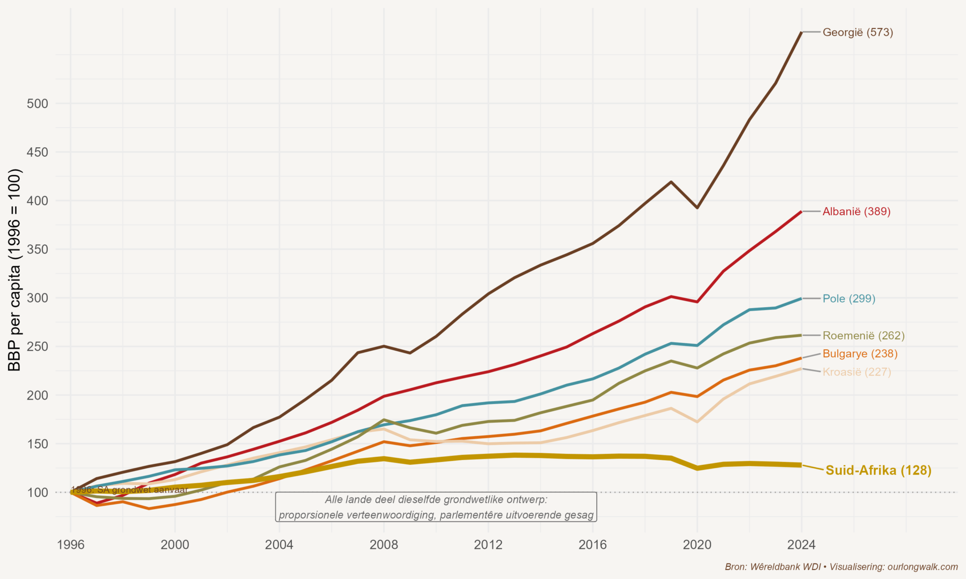 Suid-Afrika se gemiddelde groei in BBP per capita in die tydperk 1996 tot 2024 was sowat 1% per jaar. Vergelyk dit met ons land se grondwetlike eweknieë wat proporsioneel-parlementêre stelsels op soortgelyke inkomstevlakke het: Bulgarye het oor dieselfde tydperk met 3,4% per jaar gegroei en Roemenië met 3,6%. Georgië vaar beter met 6,8%. Hierdie lande deel Suid-Afrika se grondwetlike samestelling, maar hulle deel beslis nie ons groeikoers nie.