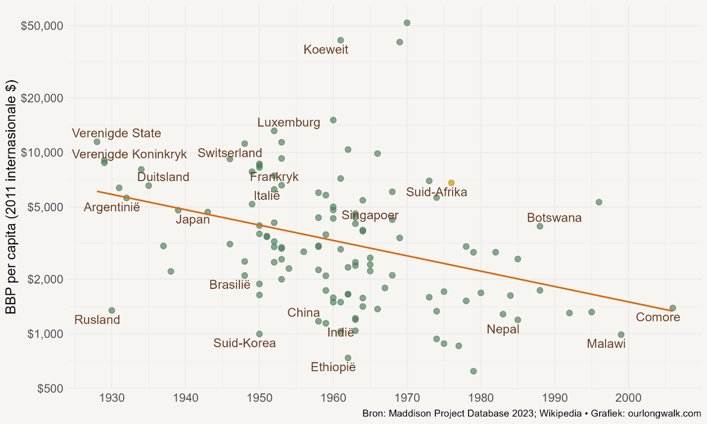 Kyk na die grafiek hier onder. Dit wys in watter jaar elke land televisie ingevoer het, teenoor sy BBP per capita op daardie stadium. Die patroon is duidelik: Ryker lande het vroeër televisies gekry. Suid-Afrika is die goue kol, opvallend regs. Hiervolgens is ons welvarend genoeg om dekades vroeër reeds televisies aan te skaf, maar het dit eenvoudig nie gedoen nie.