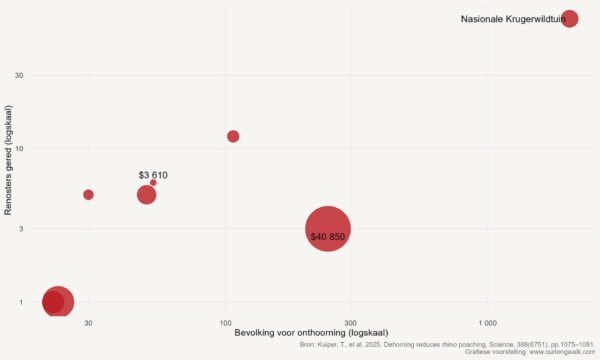 Selfs in hierdie positiewe resultate skuil daar nog heelwat onsekerhede. Kuiper se studie wys byvoorbeeld dat die koste-effektiwiteit van onthoorning baie verskil van reservaat tot reservaat. Die grafiek illustreer dit duidelik – kleiner reservate kon renosters teen betreklik lae koste red, terwyl groter reservate, soos die Krugerwildtuin, aansienlik meer moes bestee om dieselfde uitwerking te hê. Die variasie wys net hoeveel ons nog moet leer oor die praktiese toepassing van hierdie strategie.