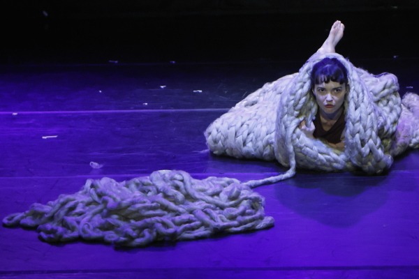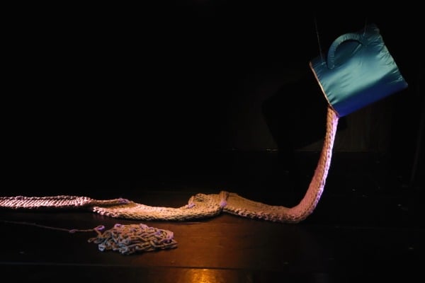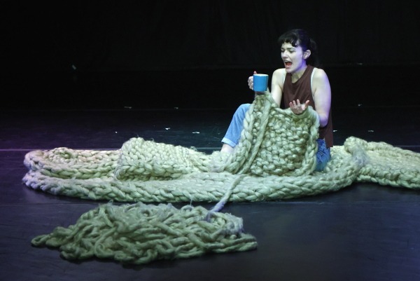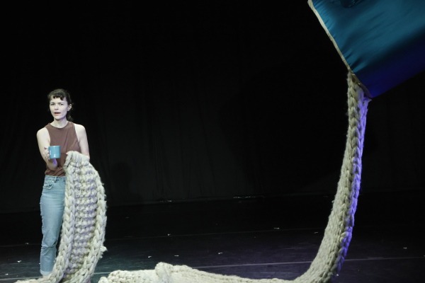 Die verhoog is leeg, behalwe vir ’n enorme koppie waaruit ’n ellelange, gebreide kunswerk hang, asof dit koffie is wat vermors word.