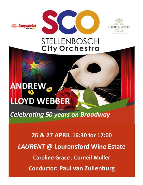 Die Lourensford-konsert gaan op twee vlakke fantasties wees. Eerstens is Laurent, waar die konsert gaan plaasvind, in ’n absoluut asemrowend mooi omgewing geleë! Tweedens bestaan die konsert uit letterlik die grootste treffers van Andrew Lloyd Webber oor die afgelope 50 jaar op Broadway. Uittreksels uit Phantom, Cats, Superstar, Joseph, Pie Jesu, Evita, Sunset Boulevard en Aspects of Love sal gehoor kan word. Dit is dieselfde program wat as “Beste Vrystaat-produksie” by die 2013 Vryfees in Bloemfontein aangewys is. Twee fantastiese Vrystaatse soliste sing saam met die SCO. Corneil Muller het verlede jaar ontsettend positiewe persresensies tydens die “Best of Broadway”-konsert saam met die BCO gekry en Caroline Grace, wat verlede jaar met groot sukses saam met die FSSO in hulle Lerner en Loewe-produksie by die Vryfees opgetree het, is so pas terug uit Japan.