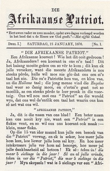 Angus, het die koerant /besigheid in 1875 tot stand gekom? Ek huldig die opinie dat die sg invloed van Khoi-tale oordryf word. Daar is dan geen ooreenkoms van bv !Xham in landswapen, met Diets-Afrikaans nie.