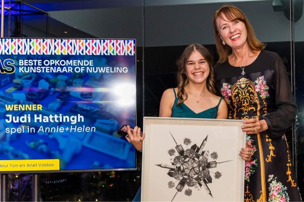 Judi Hattingh ontvang die 2025-Kanna vir beste opkomende kunstenaar of nuweling van Anet Pienaar-Vosloo, een van die borge van die Kanna-pryse. Sy en Ton Vosloo (Ton is ’n beskermheer van die KKNK) het die Kanna vir beste opkomende kunstenaar of nuweling geborg. (Foto: © Natalie Gabriels)