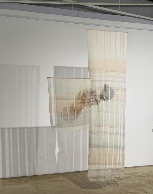 Right: Strijdom van der Merwe: Pictograph | Left: Klara du Plessis: Manipulated found sound wave visualisation (Hell Light Flesh Series) | Front: Laurel Holmes: Weight of loss