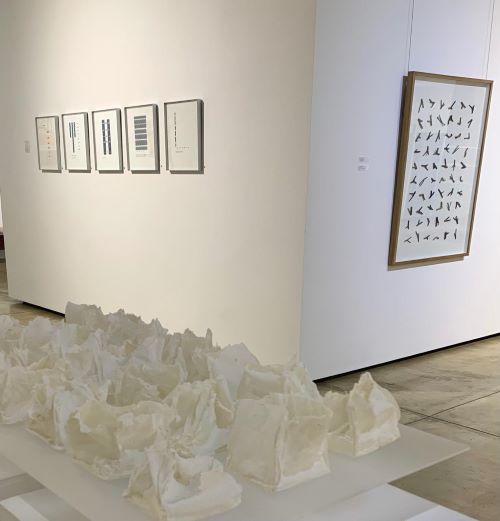 Highlights: a woven piece by Sivan Zeffertt moves almost imperceptibly when one passes. To weave is to write, she says. It moves in lines, in time; textile is text. Strijdom van der Merwe mounted and framed 60 twigs, arranged in neat lines like some kind of alphabet from the future, or from the ancient past. Adelheid Frackiewicz covers a huge sheet of paper with small lines, marking time. Maia Lehr-Sacks (Levan) delicately folds Japanese mulberry paper and scratches on it with ink, hoping that someone will stay, but also leave again. Klara du Plessis’s poems are folded and stacked like rocks by Kadie Salmon – the oldest kind of text, words through time. The word is image is landscape is body; the distances we forge do not exist. This is spatiality, Jean would say.