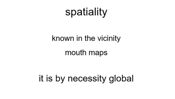 Therefore, it – spatiality – is by necessity global, unnameable because of its inexhaustible sources, inexhaustible recognisable origins. Old but beautiful words like life start to show up, wanting to reassert themselves, wanting to renew themselves, letting space appear.