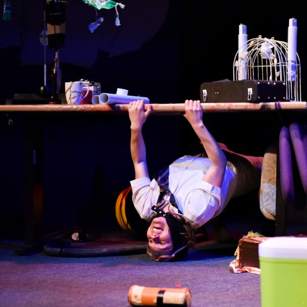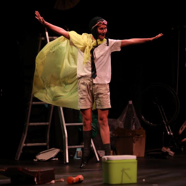 Die jongeling kom met ’n tuisgemaakte vlugpet en -bril op sy kop op die verhoog. Hy lyk soos ’n skets uit ’n kinderboek.