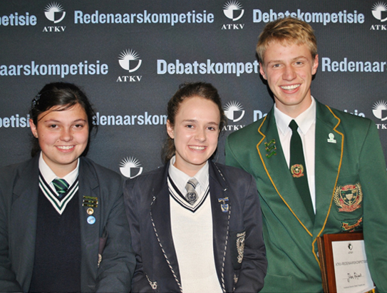 Van links na regs: In die kategorie Graad 10-12 Huistaal was Dalene Grobler van Hoërskool Hoogenhout derde. Cornita Steenekamp van Potchefstroom Gimnasium was tweede en is ook aangewys as die beste dogterspreker. Johan Taljaard van Reitz is as beste taalgebruiker, beste seunspreker en algehele wenner aangewys.
