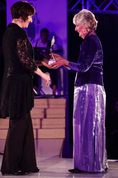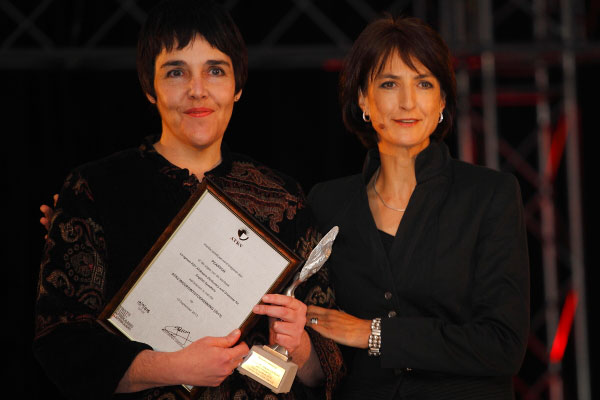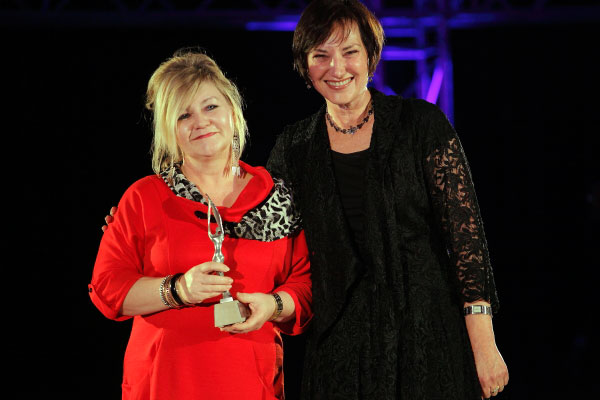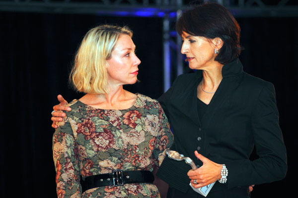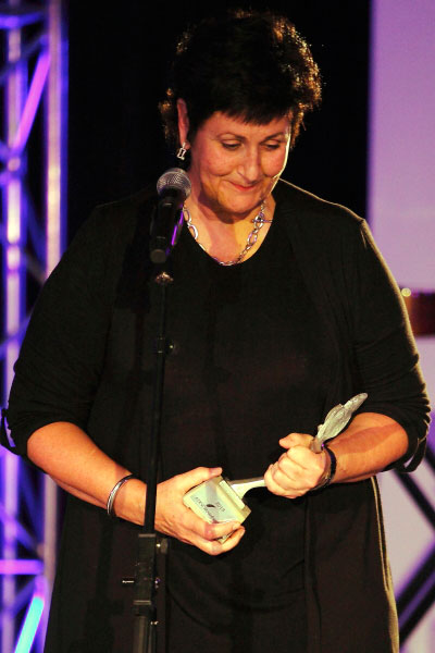 Janita Holtzhausen van Human & Rousseau neem Irma Venter se spanningslektuurprys – vir Skoenlapper – namens haar in ontvangs.