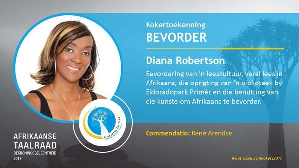 - Diana Robertson – “Bevorder”: vir haar bevordering van Afrikaans in Eldoradopark onder jongmense deur middel van dramas, vertonings, boeke, gedigte, sang en dans.