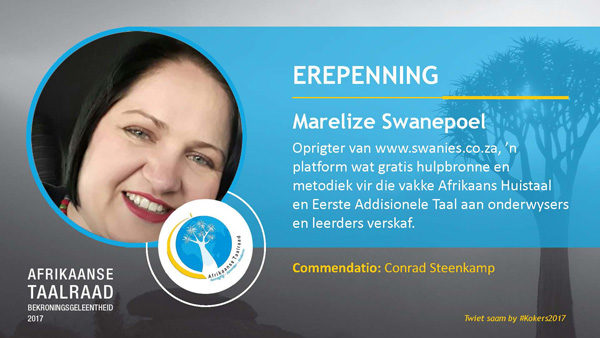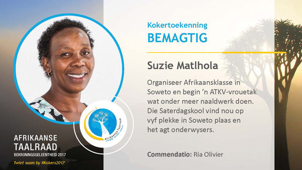 - Suzie Matlhola – “Bemagtig”: vir haar vindingryke Afrikaansklasse in Soweto, wat mense nie net bemagtig om Afrikaans aan te leer nie, maar ook positiewe houdings jeens die taal kweek.