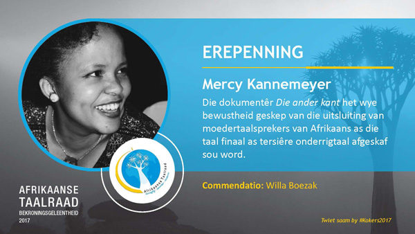 - Mercy Kannemeyer, vir haar onverskrokke bevordering van Afrikaans as akademiese onderrigtaal met haar opspraakwekkende dokumentêr “Die ander kant”.