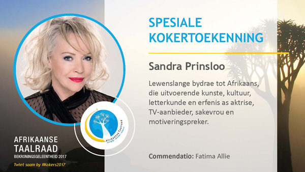 Die aktrise Sandra Prinsloo, wat bekroon is vir haar lewenslange bydrae tot Afrikaans, het gesê hierdie toekenning dra vir haar baie meer gewig as enige ander toekenning wat sy al ontvang het. Sy sê ondanks die huidige woelinge wat daar oor Afrikaans is, glo sy daar is genoeg diverse groepe mense in hierdie land wat Afrikaans praat dat ons ons nie te veel daaroor hoef te bekommer nie.