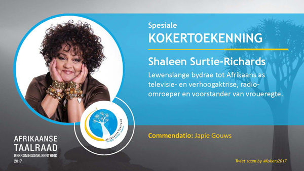 - Shaleen Surtie-Richards: vir haar bydraes tot Afrikaanse kuns en kultuur en die manier waarop sy talentvolle plattelandse Afrikaanse mense inspireer om hul drome te verwesenlik en sterstatus te bereik.