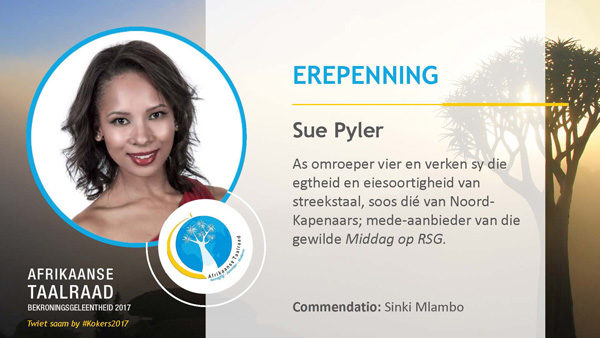 - Sue Pyler vir haar werk as Afrikaanse radio-omroeper en haar positiewe bewusmaking van die veelkantige aard van Afrikaans.