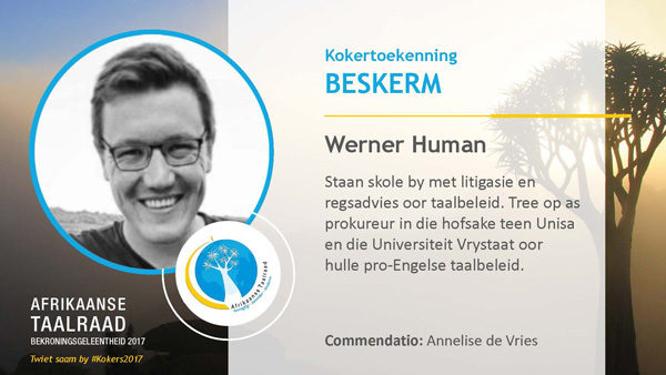 - Werner Human – “Beskerm”: as prokureur vir die beskerming van Afrikaans deur etlike suksesvolle hofgedinge.