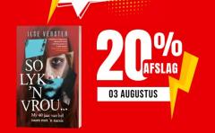 2022-08-02"Elke dag, vir 31 dae, gee ons 20% afslag op ’n nuwe Afrikaanse titel. Die boek vir 3 Augustus is So lyk ’n vrou deur Ilse Verster."