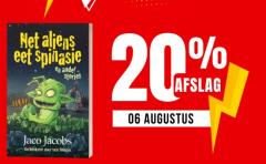 2022-08-05"Elke dag, vir 31 dae, gee ons 20% afslag op ’n nuwe Afrikaanse titel. Die boek vir 6 Augustus is Net aliens eet spinasie deur Jaco Jacobs."