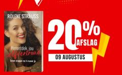 2022-08-08"Elke dag, vir 31 dae, gee ons 20% afslag op ’n nuwe Afrikaanse titel. Die boek vir 9 Augustus is Herontdek jou selfvertroue deur Rolene Strauss."