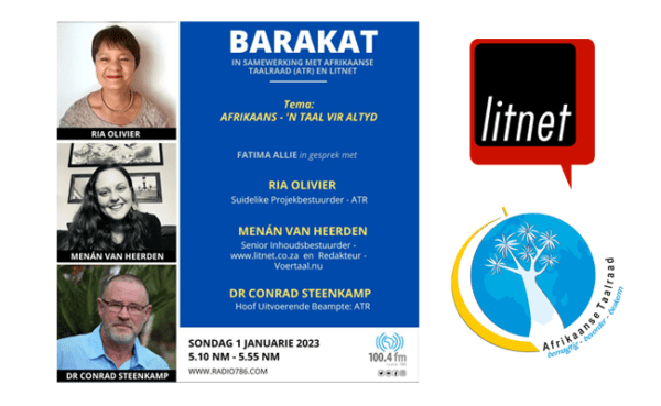 LitNet argiveer Radio 786 se maandelikse Barakat-program. Barakat, met Fatima Allie, word aangebied in samewerking met die Afrikaanse Taalraad en LitNet. Vir die Januarie 2023-program gesels Fatima Allie met Conrad Steenkamp, Ria Olivier en Menán van Heerden oor onder andere die Afrikaanse Taalraad, LitNet Akademies en verskeie onderwerpe mbt Afrikaans.