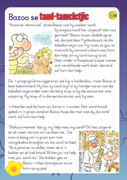 Vet pret in Afrikaans! Daar is splinternuwe Afrikaanse stories in elke uitgawe en dit skep die konteks vir die aktiwiteite wat noodsaaklike vaardighede in die voorskoolse fase aanspreek. Bazoo is dus ’’n “werkboekie” in die sin dat die meeste bladsye in die tydskrif aktiwiteite bevat wat kinders in die boekie self kan doen. Elke uitgawe het ook ’n interessante artikel vir Mamma en Pappa oor jou kleuter se gesonde ontwikkeling, ’n bak-en-brou-aktiwiteit, buitespeel-idees of ’n “oefen saam met Bazoo”-bladsy!