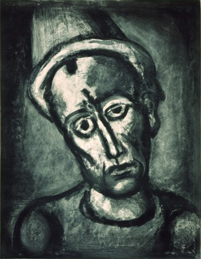 Figuur 3. Georges Rouault (1871–1958), Wie dra nie ’n masker nie? (Qui ne se grime pas?), selfportret (1923). Ets, akwatint en gemengde media oor heliogravure in swart ink op papier, 8/500, 56,5 x 43 cm. Die agtste plaat van ’n oplaag van 500, as deel van die reeks Genade en oorlog (Miserere et guerre). Chicago: LUMA-Loyola University of Chicago Museum of Art. http://www.allinsongallery.com (5 November 2013 geraadpleeg). |