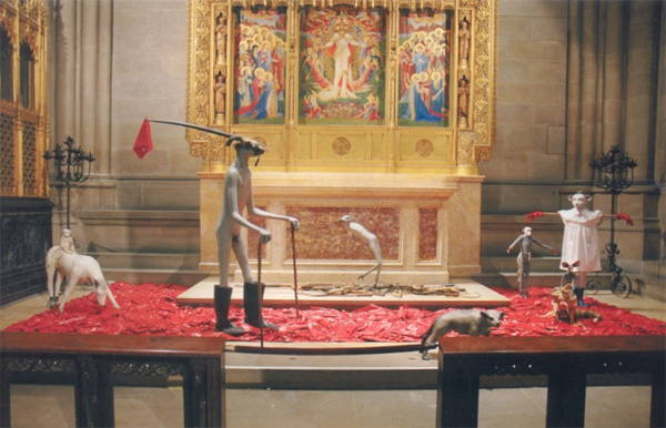 Figuur 12. Jane Alexander (1959–), The sacrifices of God are a troubled spirit (2002–2004). Versterkte gips, olieverf en gemengde media, wisselende afmetings. Die installasie bestaan uit ’n lam (met dorings en gesteelde stewels), omring deur verskillende figure: ’n bewaker (Guardian), ’n vlermuisoor-pop wat ry op ’n vlermuisoor-jakkals wat ’n swart gevoeringde jakkalsvel dra; ’n gespande herkouende dier met ruiter; ’n aankondiger of voorloper (Harbinger) met stewels; ’n voël tussen pangas en sekels, ’n jakkals. New York: Katedraal van die Heilige Johannes http://africasacountry.com (12 September 2013 geraadpleeg). © Jane Alexander/DALRO 2014. |