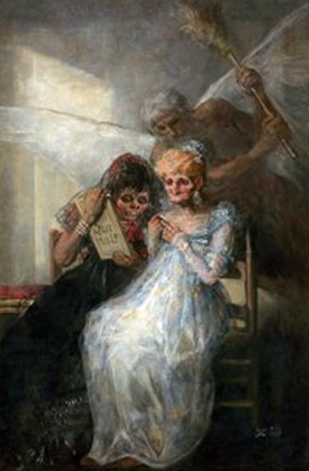 64 In Jy wat nie kan nie (Capricho 42) verenig Goya byvoorbeeld die stylfiguur van ’n omgekeerde wêreld om die adel te teiken: metafories ry hulle – as donkies – op die rûe van die hardwerkende armes. Sy kommentaar op heksery, prostitusie en die wanpraktyke van die kerklikes is nog veel meer ontstellend en donker.