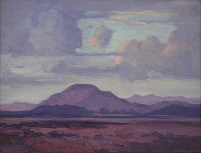 He painted series of archetypal Karoo landscapes, emphasising the severity of the shadows to construct his pictorial plane. His subject - man-made structures and occasional people – is rooted by strong horizontal lines, which allow his backgrounds to suggest an infinity that is almost overwhelming. (Hilton-Barber 2003:25)