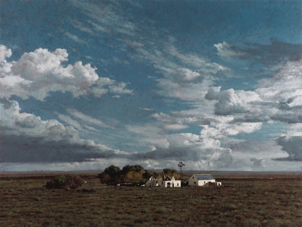 In die skildery van Meyer, na wie al verwys is as die tweede Pierneef, word ’n ander beeld van die Karoo gebied. Hier is die landskap nie meer leeg en onbewoon nie, maar is die afdruk van menslike aktiwiteite op die landskap duidelik sigbaar, alhoewel dit geensins geïdealiseerd is nie. Inteendeel, ’n foto-realistiese, oftewel nuwe realistiese,6 weergawe word aangebied en die impak van tyd op menslike aktiwiteite is duidelik sigbaar in die verwering van die bouwerk. Waar die natuur en plaasopstal ongerep en vol belofte in Pierneef se skildery is, vertel hierdie skildery ’n ander verhaal. Die verwering deur die elemente soos dit geïmpakteer het op die opstal is duidelik. Die Groot Karoo is hier ’n harde werklikheid. Hilton-Barber (2003:24) merk op dat dit juis sy Karoo-landskappe was wat Meyer as ’n ernstige landskapkunstenaar gedefinieer het. Hy skryf: