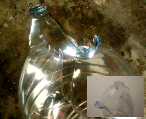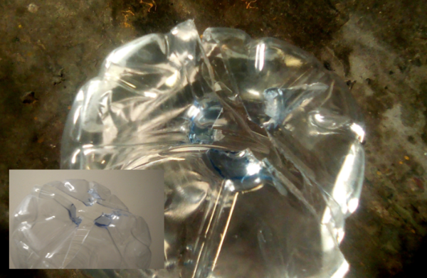 Bo: Die oopgebarste 5 liter-bottel oomblikke nadat die punt daardeur is. Let op die water op die paneel agter teen die muur.