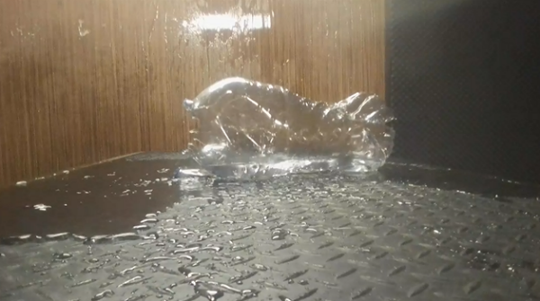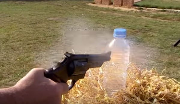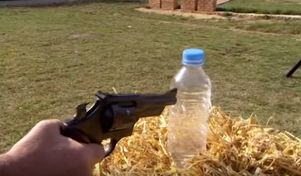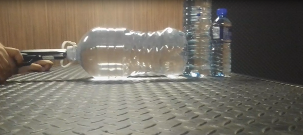 Die volgende video is spesiaal vir die doel van hierdie artikel geneem, by City Guns in Kaapstad, uitgevoer deur Alan Marthezé, ‘n wapenkenner en -instrukteur. Dit moet duidelik gemeld word dat die vooropstelling nié is dat die waterbottels die liggaam ten volle simuleer nie. Daar is natuurlik heelwat verskille tussen die twee scenario’s. Die bottel se plastiekwand is harder en minder elasties as die sagte weefsel van byvoorbeeld die derms. Hoewel die liggaam uit baie water bestaan, is die watervolume en -digtheid in die bottels disproporsioneel hoër. Maar aan die ander kant is die 5 liter-bottel groter as die abdominale holte (en het daarom meer spasie om inkomende lug of gas te akkommodeer), en die wapen steek nie in die bottel in soos wat dit in die anus vasgeklem sou word en meer gas binne sou hou nie. Die primêre doel is eerder om ’n basiese idee te gee van die effek van die gasontlading in water in ’n beperkte spasie (dus die effek van hidrostatiese druk) en dan sekondêr om te wys hoe ’n 9 mm deur 52 cm watermassa skiet.