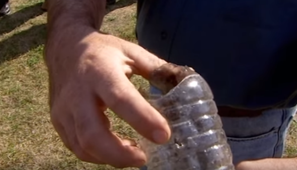 Bo: Die bottel het aan sy bokant heeltemal oopgebars. Hoewel die patroon nie ’n punt in gehad het nie, het die warm gas steeds regdeur die bottel geskiet.