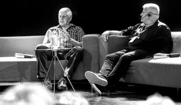 Later is al die skrywers op die verhoog, netjies in ’n ry soos eendjies. “Ek wonder of ons ook kruisbeen op die bank sal kan sit?” fluister Tom Dreyer. Ek hoor hom verkeerd. Ek organise net daar dat ons moet kyk of ons almal op die bank sal kan inpas. Ek is die enigste vrou tussen al die mans. Natuurlik moet ek my posisie misbruik – ek gaan sit op Sidney se skoot.